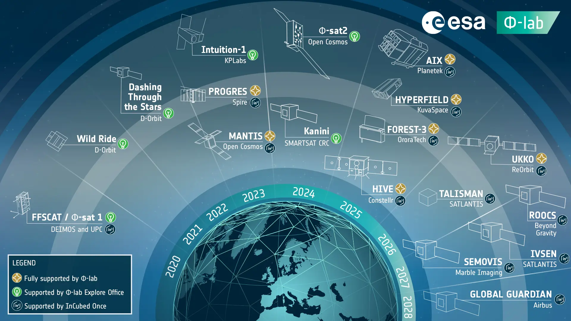 The Φ-lab Explore Office continues to accelerate the adoption of the digital revolution on board of satellites. We have contributed to the genesis of the Φ-sat programme and supported the AI elements of Φsat-1, Φsat-2, Intuition 1, Kanyini, OPS-SAT, etc., together with studies for ESA operational missions. Through InCubed, we have supported the development of several emerging EO data and services constellations.