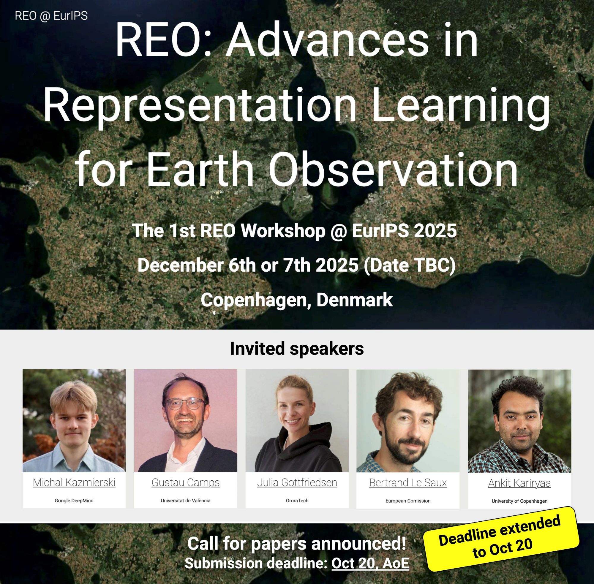 Taking place at the Bella Center Copenhagen on 6/7 December 2025, the Representation Learning for Earth Observation (REO) workshop – part of EurIPS, a European conference officially endorsed by NeurIPS – will gather experts from machine learning, computer vision, and Earth sciences to present the latest research, discuss real-world scientific uses, and share innovative system designs.